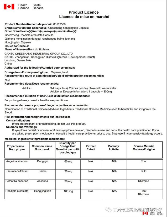 2021年10月19日,甘肅奇正實業(yè)集團(tuán)有限公司向加拿大衛(wèi)生部提交的奇正紅景天當(dāng)歸人參百合膠囊產(chǎn)品正式獲得加拿大衛(wèi)生部批準(zhǔn),獲得加拿大健康產(chǎn)品注冊號。注冊證書如下: