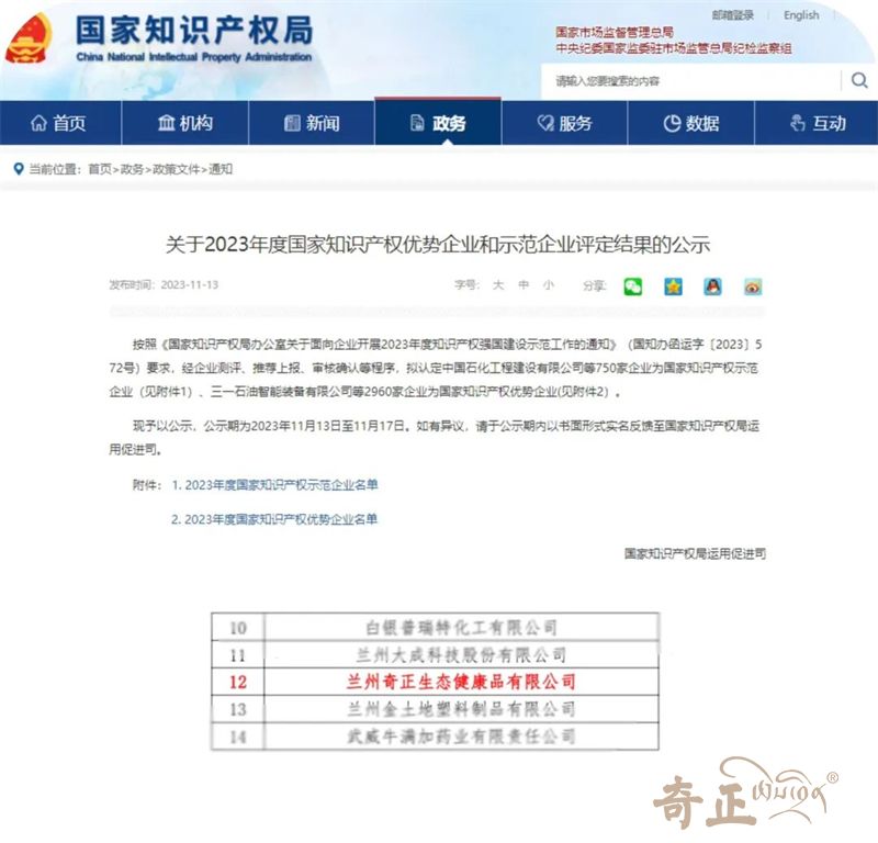 近日,國家知識產(chǎn)權(quán)局發(fā)布了《關(guān)于2023年度國家知識產(chǎn)權(quán)優(yōu)勢企業(yè)和示范企業(yè)評定結(jié)果的公示》,蘭州奇正生態(tài)健康品有限公司(以下簡稱“奇正健康”)憑借在知識產(chǎn)權(quán)領(lǐng)域的突出優(yōu)勢,榮膺2023年國家知識產(chǎn)權(quán)優(yōu)勢企業(yè)。