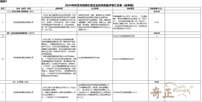 根據(jù)《林芝市推進改革開放促進招商引資試行辦法》(林政發(fā)[2022]69號)相關(guān)規(guī)定,經(jīng)林芝市招商引資企業(yè)扶持獎勵資金評審小組及林芝市發(fā)展和改革委員會黨組研究同意,林芝雪域資源科技有限公司共獲批2024年度招商引資企業(yè)扶持獎勵資金45.29萬元,其中包括:一是根據(jù)公司2023-2024年期間銷售額、工業(yè)增加值、區(qū)內(nèi)采購指數(shù)、帶動就業(yè)以及研發(fā)投入強度等情況,給予一定企業(yè)成長扶持獎勵資金,用于支持研發(fā)創(chuàng)新和擴大再生產(chǎn)的企業(yè)做大做強獎勵25.29萬,二是對公司引進的博士學歷且全職服務 2 年及以上的高層次人才,一次性給予的安家補貼10萬元,三是對公司2023-2024年期間新申報的發(fā)明專利給予一次性扶持獎勵資金10萬元。